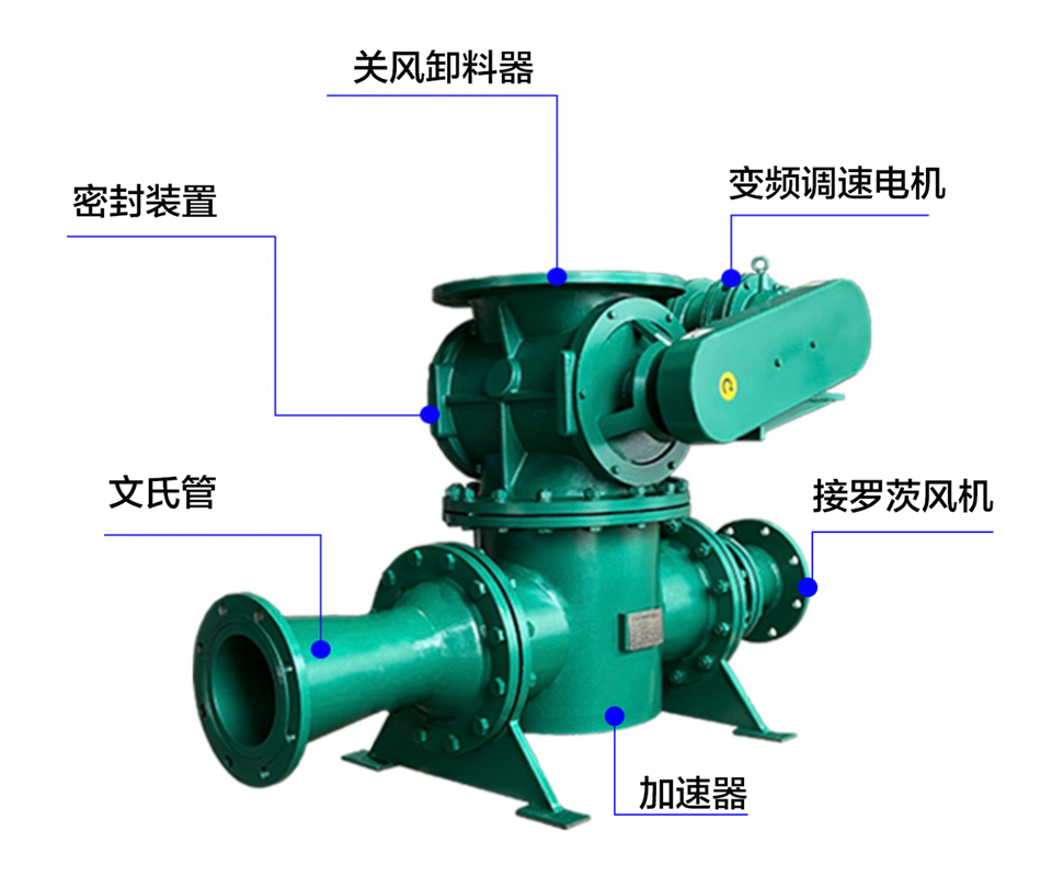 氣力輸送設備(簡稱:噴射泵)以羅茨風機為動力氣源,運用以流態(tài)化技術,射流技術和壓差原理相結合,以電動關風機為供料裝置,將粉料送入料氣混合室,粉料在料氣混合室流態(tài)化的同時,利用噴嘴產(chǎn)生的高速氣流將粉料送入加速室,以懸浮流進入輸送管道,壓力差將粉料沿管道送入受料倉內,料氣分離經(jīng)布袋除塵器過濾后將氣體排入大氣。