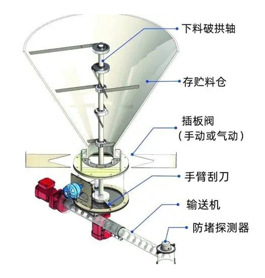 破拱機的主要部件是破拱軸在料倉錐斗內由減速電機帶動其旋轉,通過軸上的柔韌刮片有效防止拱橋形成并確保持續流動,直接連接在軸上的手臂刮刀使計量輸送機能完全被物料填滿,從而有效精確地完成體積輸送。