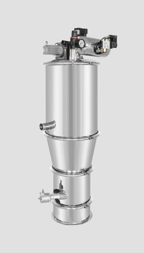 真空上料機是利用真空設備產(chǎn)生的負壓氣流,將物料從進料口被吸入。然后在真空上料機的過濾倉內(nèi)將空氣與物料進行分離。物料因重力作用而自動落下,物料被收集在料倉中。我們的旋風分離器阻止細小粉末進入過濾器,以提高過濾器的效率。待料倉充滿物料時,真空泵自動關閉,輸送設備內(nèi)的壓力達到平衡。放料閥開啟,物料通過出料口流出,并直接落入儲料容器。出料時,過濾芯被反吹氣囊自動清潔。如物料較為粘稠,我們可以安裝特制的振動器輔助下料。下料結(jié)束出料艙自動關閉,整個輸送流程再次啟動。