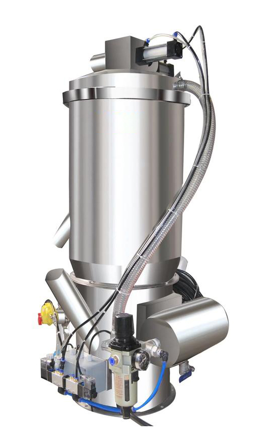 真空上料機是利用真空設備產生的負壓氣流,將物料從進料口被吸入。然后在真空上料機的過濾倉內將空氣與物料進行分離。物料因重力作用而自動落下,物料被收集在料倉中。我們的旋風分離器阻止細小粉末進入過濾器,以提高過濾器的效率。待料倉充滿物料時,真空泵自動關閉,輸送設備內的壓力達到平衡。放料閥開啟,物料通過出料口流出,并直接落入儲料容器。出料時,過濾芯被反吹氣囊自動清潔。如物料較為粘稠,我們可以安裝特制的振動器輔助下料。下料結束出料艙自動關閉,整個輸送流程再次啟動。