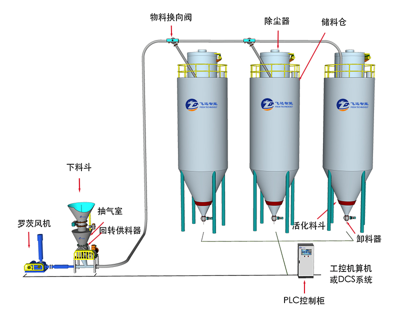 ? ? ? ?稀相輸送的介質(zhì)一般采用空氣或氮氣,動力提供一般由羅茨真空泵提供,若采用氮氣時一般有制氮機供氣,但整個系統(tǒng)會考慮采用氮氣循環(huán)利用,結(jié)構(gòu)較復(fù)雜。羅茨真空泵的稀相輸送時,物料在管道中呈懸浮狀態(tài),輸送距離可達數(shù)百米,稀相負壓的主要特點是可以從多點的低處或散裝處向高處一點或多點進行輸送,在該系統(tǒng)的開始端約有600m/min 的加速度,在末端可達2000m/min 的高速,因此氣流速度較高。輸送管線初端壓力一般低于0.05Mpa,而末端則與大氣壓基本接近。?