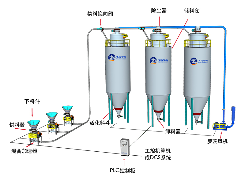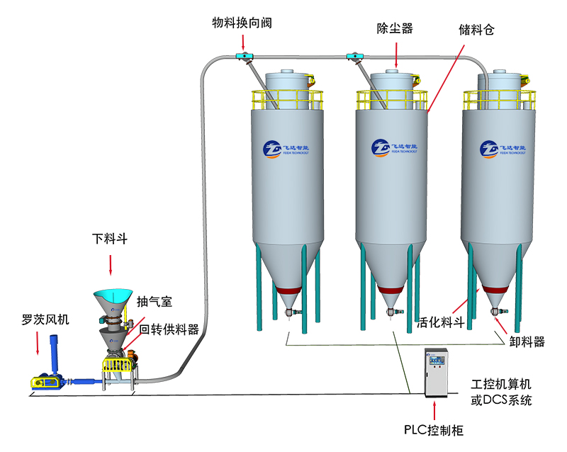 用螺旋供料器和羅茨風機相結合的方式實現正壓稀相輸送;